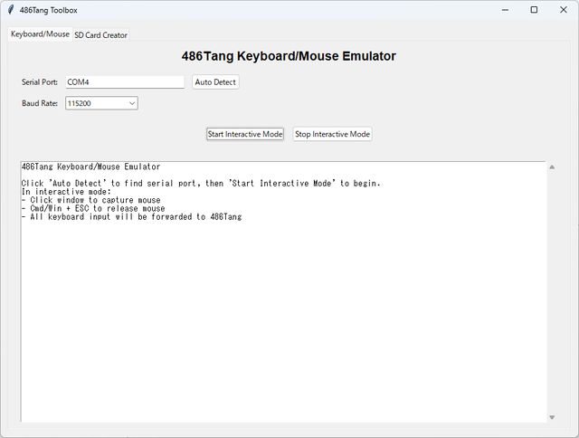 SerialPortの設定を行い、「Start Interactive Mode」を行うと、以下のウィンドウが表示されKeyボードとMouseがエミュレーションされます。