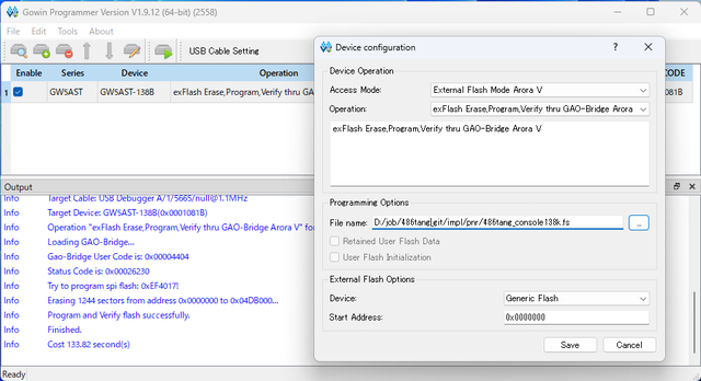 GOWIN Programmerが書き込み中に固まることがありました。環境依存のようで、USBケーブルを短いノイズ対策品に替えるか、別のPCで実行すると安定することが多いようです。